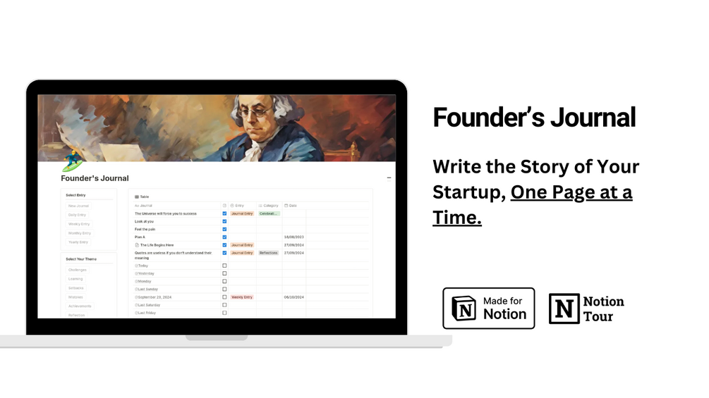 Every great startup has a story, and the Founder's Journal helps you capture yours. Built exclusively for founders, this Notion template is your personalized space to document the highs, the lows, and every learning experience in between.